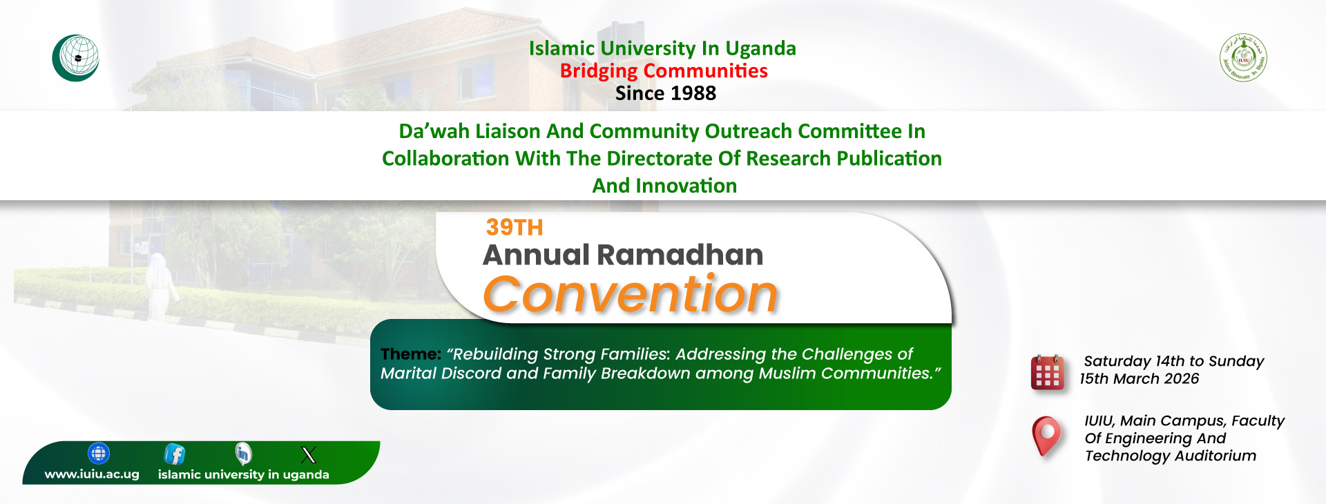 The Islamic University in Uganda was opened in the year 1988 by the Organisation of Islamic Cooperation (OIC) under a bilateral agreement between the Government of Uganda (GOU) and the OIC. In 1990, the Parliament of Uganda enacted a law, The Islamic University in Uganda Act (cap 131, Laws of Uganda), formally establishing the University in Uganda. The University operates under the framework of this Act. The University opened on 10th February 1988 with 80 students and two degree programmes. Currently, we have over 120 accredited programs, 8 Faculties and a student population of over 10,000 coming from 21 different countries. The University has so far graduated over 45,000 students from various disciplines.