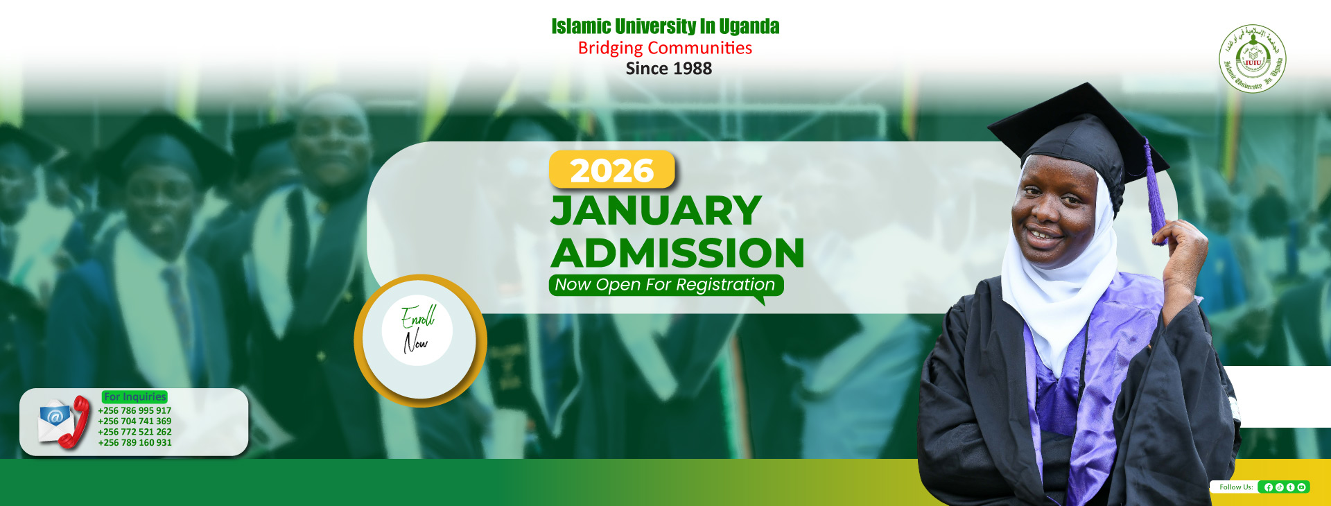 The Islamic University in Uganda was opened in the year 1988 by the Organisation of Islamic Cooperation (OIC) under a bilateral agreement between the Government of Uganda (GOU) and the OIC. In 1990, the Parliament of Uganda enacted a law, The Islamic University in Uganda Act (cap 131, Laws of Uganda), formally establishing the University in Uganda. The University operates under the framework of this Act. The University opened on 10th February 1988 with 80 students and two degree programmes. Currently, we have over 120 accredited programs, 8 Faculties and a student population of over 10,000 coming from 21 different countries. The University has so far graduated over 45,000 students from various disciplines.
